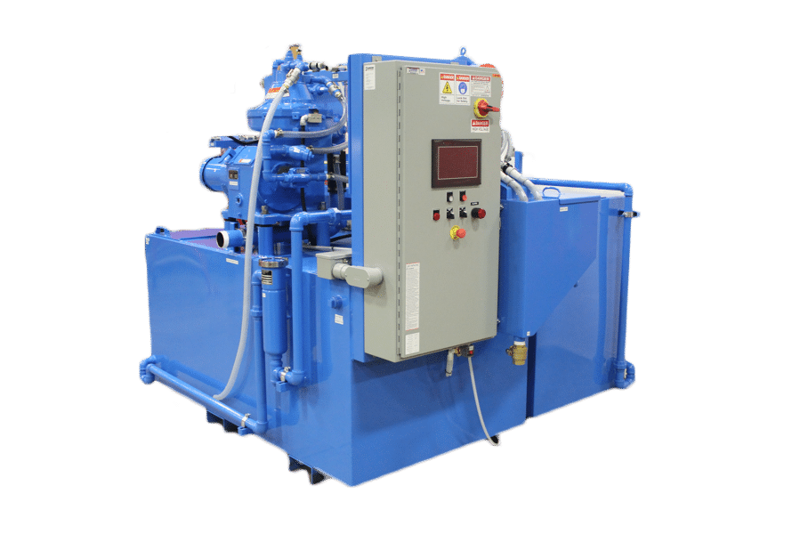 The Patriot IFR System is integrated with either 250-gallon/250-gallon or 500-gallon/500-gallon process tanks that are equipped with a proprietary mixing system to provide a homogeneous feed to the high-speed disc centrifuge. The Patriot system is also furnished with a hydrocyclone pre-clarifier to remove gross solids and minimize loading on the centrifuge.  The pre-clarified coolant is then directed to an economizer to preheat the water-soluble coolant prior to entering an immersion electric heat chamber or pasteurizer where the coolant is heated to 165° F to sterilize the coolant and kill any bacteria and/or fungal growth. The heated coolant is then directed to the centrifuge where an efficient three-phase separation occurs at 9,000-g’s of centrifugal force occurs to remove tramp oil down to 0.0025% and metal fines, swarf and particulate matter, etc. to ≤1-micron range.